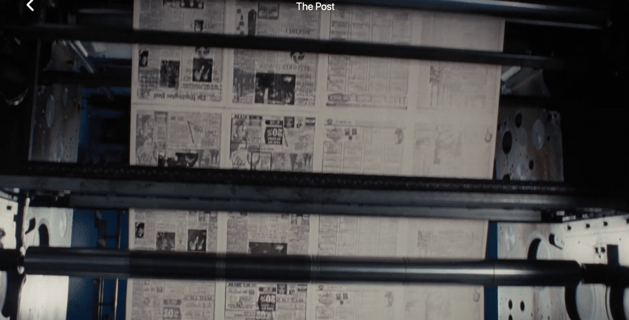 Benjamin described a kind of film which could inspire “the progressive attitude,” one “characterised by an immediate, intimate fusion of pleasure – pleasure in seeing and experiencing – with an attitude of expert appraisal,” where uncritical consumption was impossible, and spectators would grapple with reality while being entertained.[6] There are two fronts on which The Post earns its progressive sensibility. First, The Post takes for granted – and therefore elegantly sacralises – the tremendous power of mass consumption of newspapers. The ostensive question consuming the plot is whether or not Graham will decide to print, but this is a foregone conclusion to the audience who know how history has played out, and who can also easily recognise that the cultic superstars Hanks and Streep will make the morally courageous decision to do so. Nevertheless, the technology of the printing press enjoys a weighty, uninterrupted montage where an antecedent printing factory exults on the screen, churning and huffing out pages of truth. This dramatises the pivotal role of technology in resistance (see figure 2). As Benjamin writes, such scenes “train human beings in the apperceptions…needed to deal with a vast apparatus whose role in their lives is expanding almost daily.”[7] The attention The Post pays to media literacy in the wake of technological advancements resounds in the post-truth Trump era by confronting the conflict between government and the people through affirming The Truth’s centrality to a constitutional democracy – where the government deliberated denied the population honesty with ‘fake news.’
